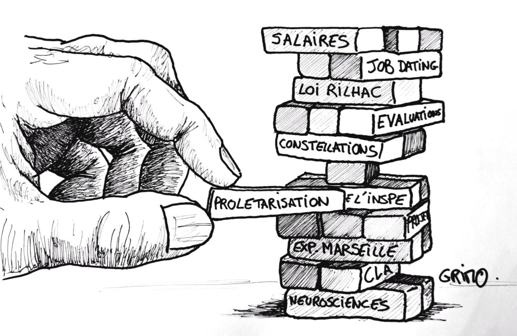 Déqualification et précarisation déséquilibrent ainsi un peu plus chaque fois la tour du métier en prolétarisant les professeurs des écoles, jusqu’à l’effondrement. Bien sûr ils ne jouent pas l’un contre l’autre, mais sont dans le même camp, celui du néolibéralisme[8].